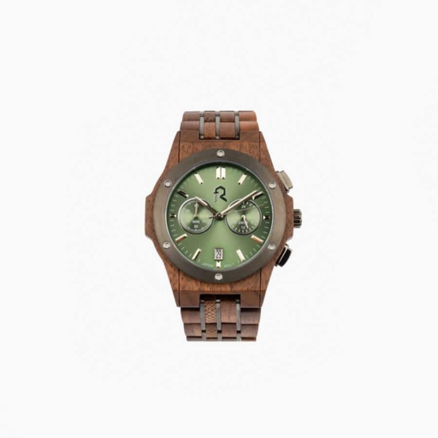 This is a sophisticated luxury chronograph watch featuring a rich green dial with dual sub-dials and a date display. The dark luxury casing and matching strap are accented with metallic links, combining natural elegance with modern design for a bold yet refined look.